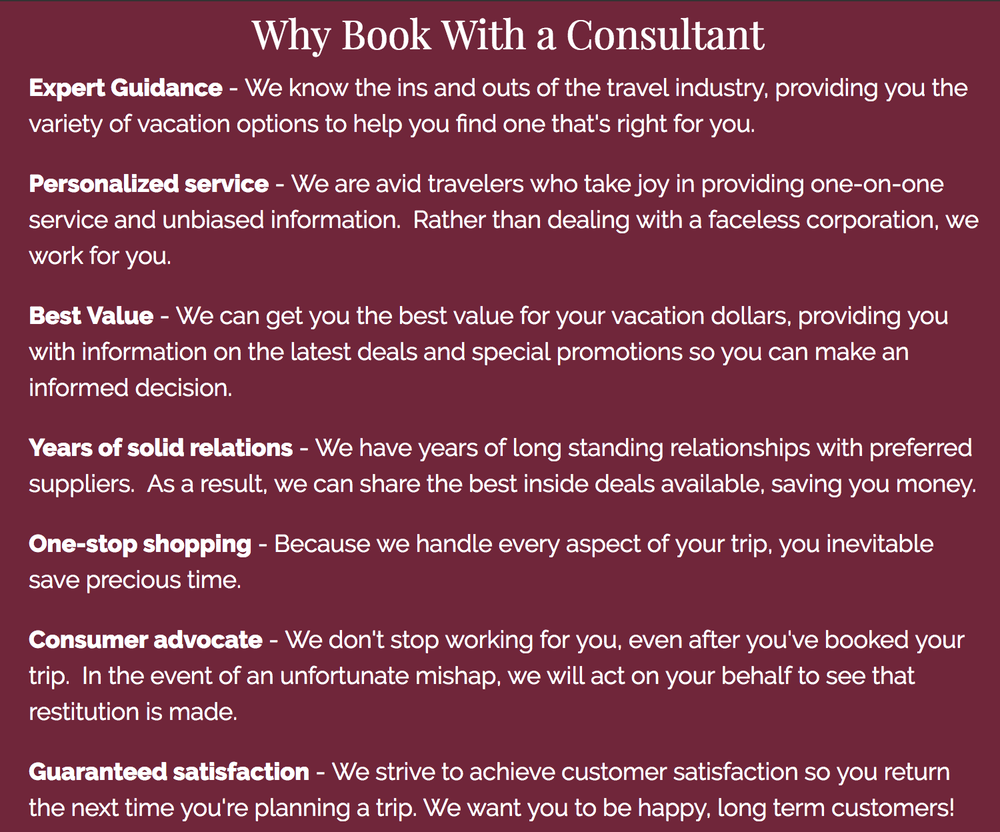 One World Travel Co. is a full service travel company with the knowledge, experience, and state-of-the-art computer programs necessary in finding you the best and most exclusive travel deals. Our specialties include honeymoons, family reunions, luxury vacations and cruises, and customized tours. Traveling well is an art and we’ve perfected the craft.